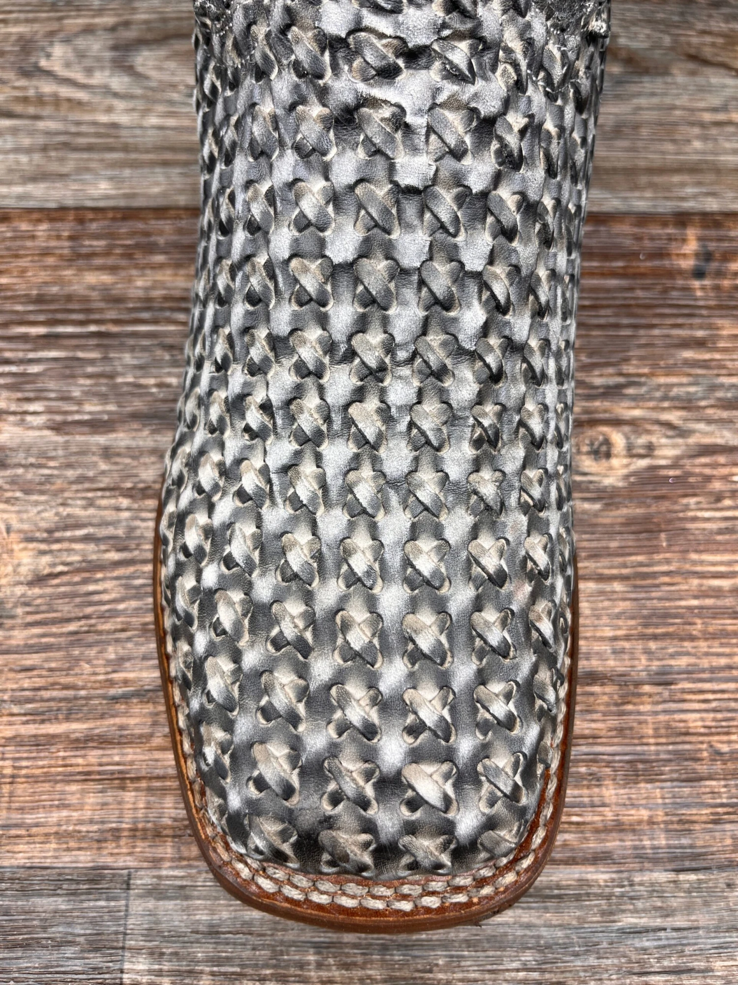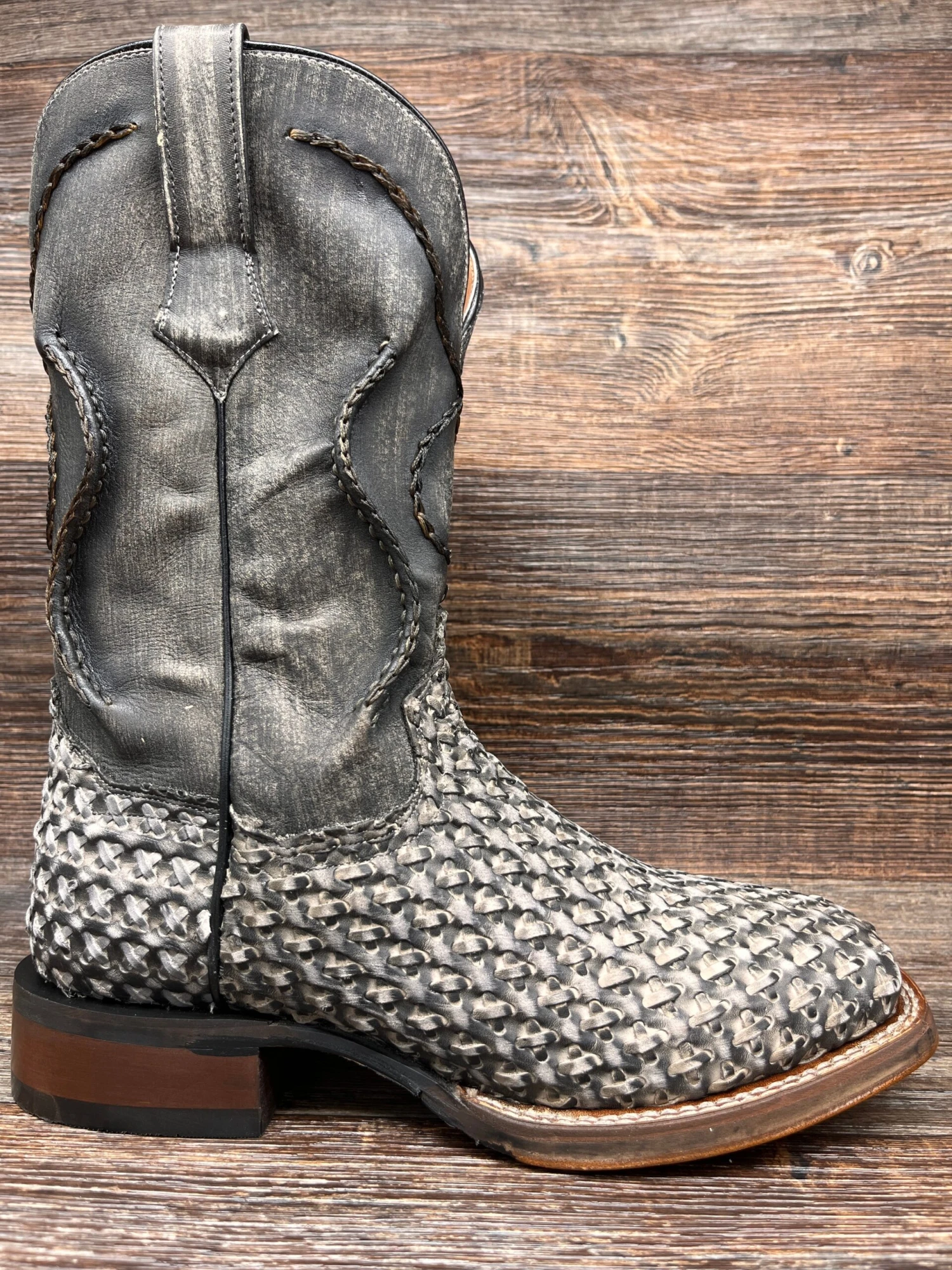 Craftmanship is front and center on the Cowboy Certified Stanley boot. The black distressed upper has hand corded leather lacing. The foot is an intricate eye-catching woven leather design. The Soft Strike removable insert gives comfort from the first step. Featuring our popular broad square toe, stockman heel and long-wearing Cowboy Certified outsole. Innovative western design from top to toe.