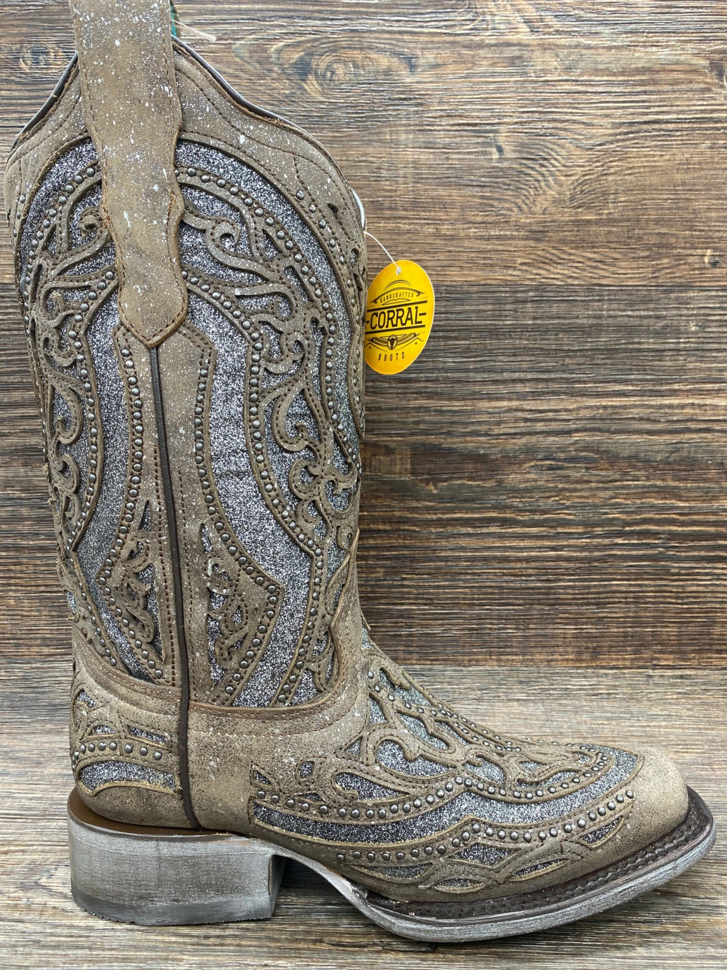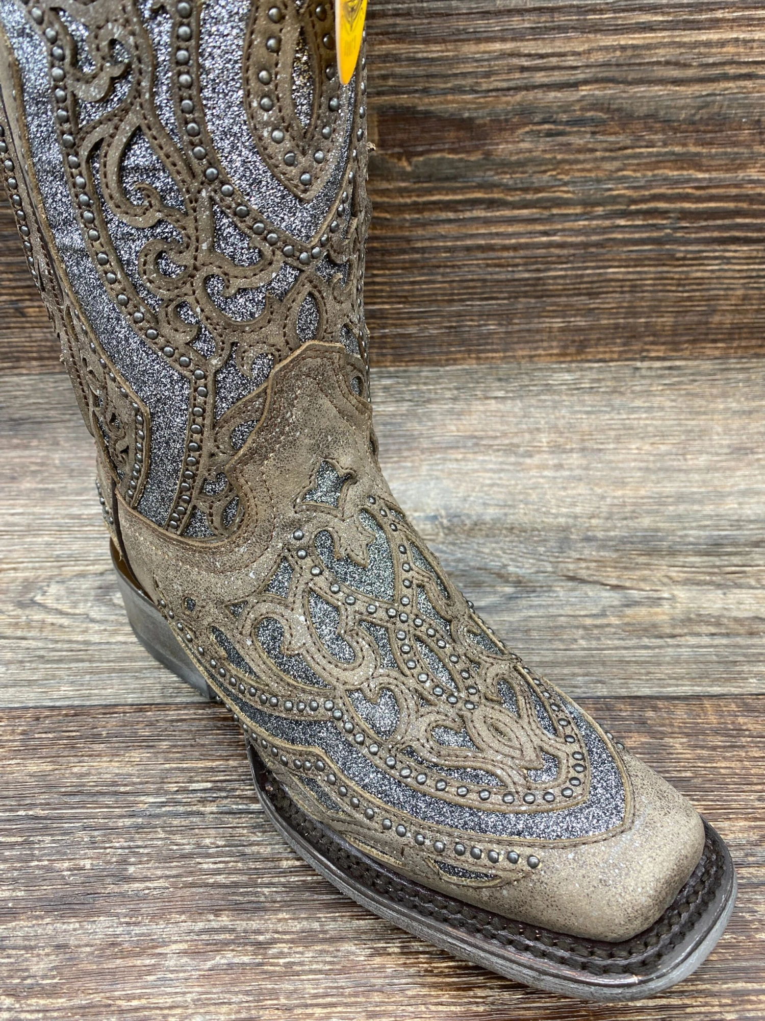 Ladies Brown/Grey Inlay Embroidery & Studs Sq. Toe – A smooth grey glitter is featured by a cedar brown laser cut overlay design. This boot adds class and touch of glam to any outfit it is paired with.