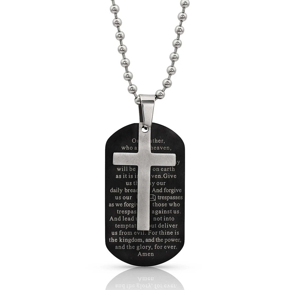 You’ll never forget the Lord’s Prayer with this 2-piece stainless steel pendant necklace. A subdued stainless steel tone cross pendant hangs in front of a black stainless steel dog tag pendant, engraved with the Lord’s Prayer. “Our Father, which art in heaven, Hallowed be thy Name. Thy Kingdom come. Thy will be done in earth, As it is in heaven. Give us this day our daily bread. And forgive us our trespasses, As we forgive them that trespass against us. And lead us not into temptation, But deliver us from evil. For thine is the kingdom, The power, and the glory, For ever and ever. Amen.” Pendants hang on a stainless steel simple bail on a 22 inch bead chain.